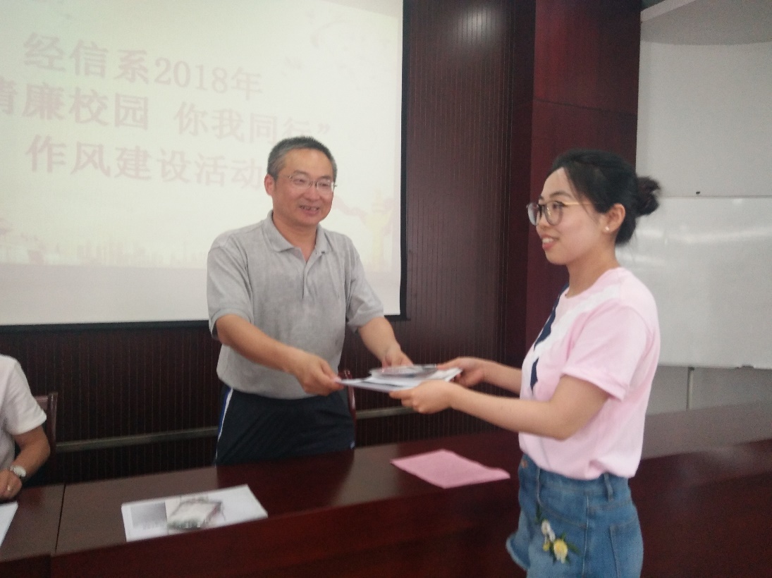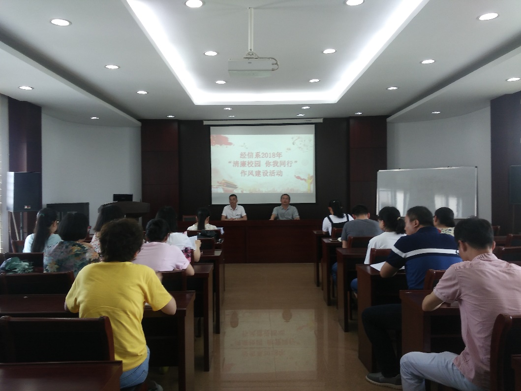 活动首先由王明照组织传达《关于开展2018年“清廉校园 你我同行”作风建设活动月的实施方案》的通知,要求全系老师以身作则,自觉参与,以高尚的师德情操感染学生。会上,全系教工与系里签订《经济与信息管理廉洁从教承诺书》。