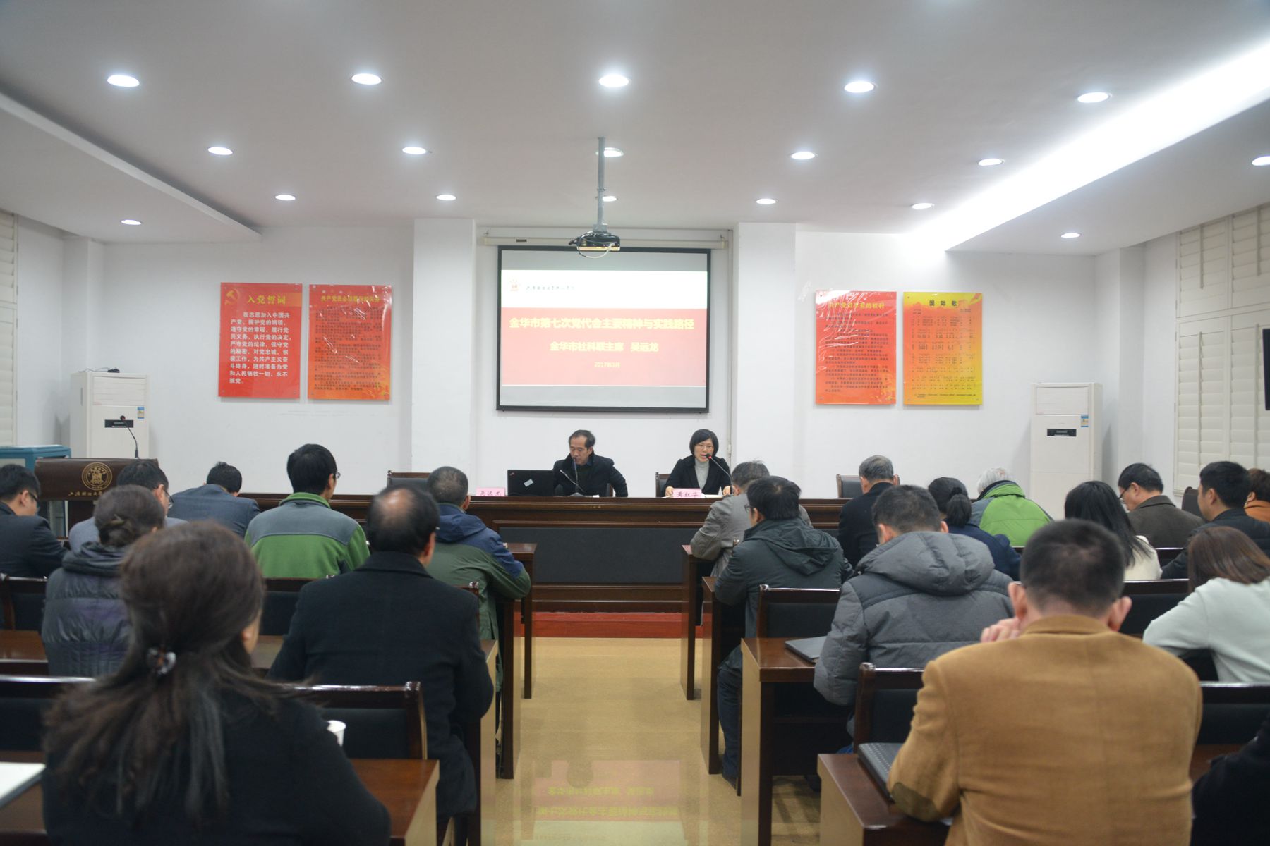 3月15日晚,学院中层干部周三夜学讲坛在党员之家举行,金华市社科联主席吴远龙应邀作题为“市第七次党代会主要精神与实践路径”的专题报告。学院领导、中层以上干部、各系(部)综合办、学工办主任等60余人参加学习,夜学由纪委书记黄红华主持。