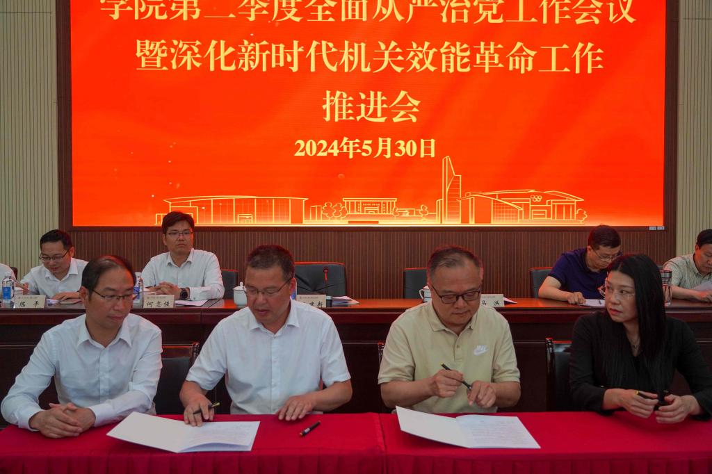 5月30日下午,学院在行政楼120报告厅召开2024年第二季度全面从严治党暨深化新时代机关效能革命工作推进会。学院党委书记王建新主持会议并讲话,学院领导班子成员、全体中层干部、系(部)综合办主任、学工办主任、专兼职纪检人员参加会议。