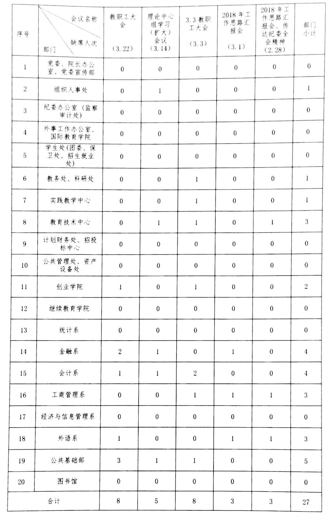 根据党院办提供的会议考勤记录单及所附请假情况,共计27人次缺席并未见请假手续。具体情况如下: