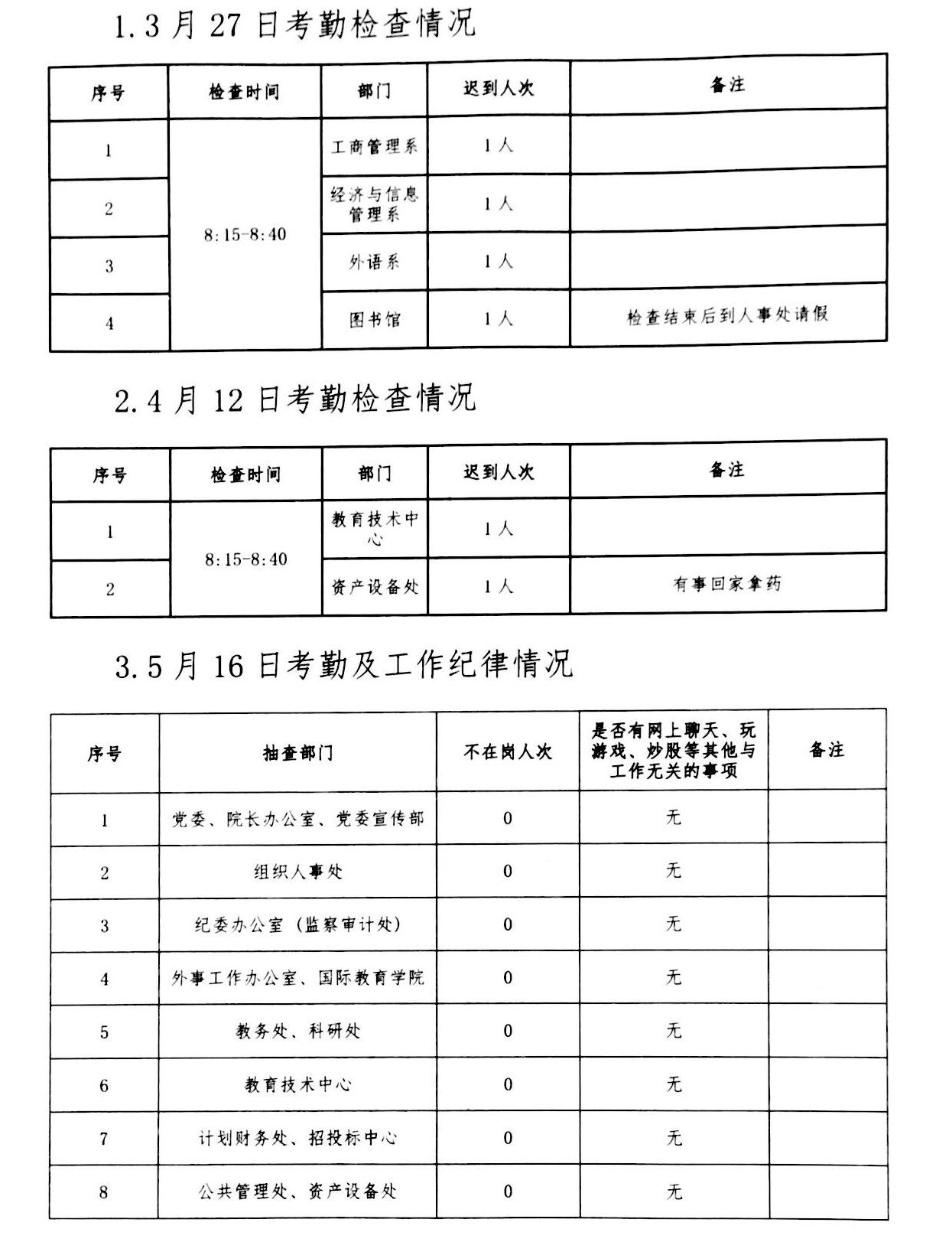 本学期人事部门、监察部门等部门共开展3次教职工考勤及工作纪律检查,具体情况如下: